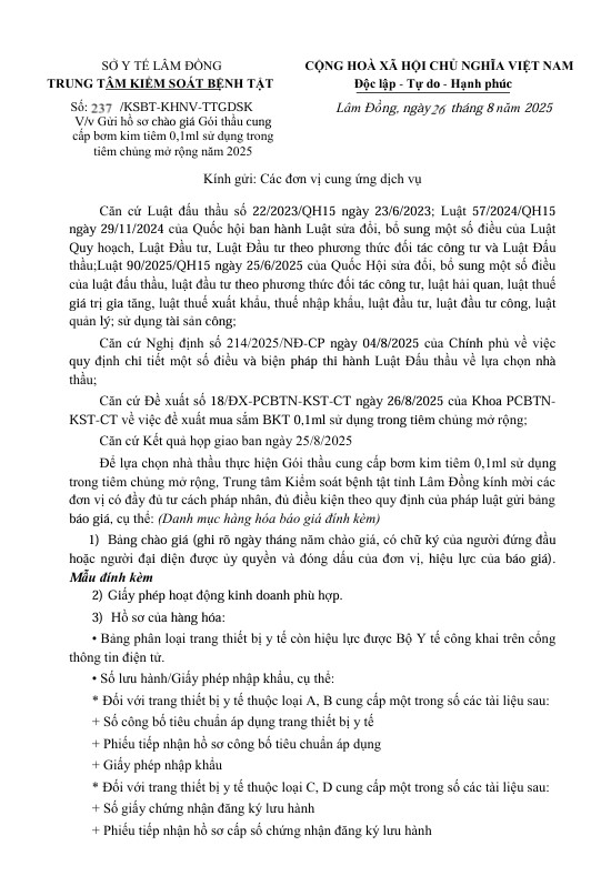 Thứ ba, 26/08/2025 | 09:09 - 8 A- A A+ | Gửi hồ sơ chào giá Gói thầu cung cấp bơm kim tiêm 0,1ml sử dụng trong tiêm chủng mở rộng năm 2025 document__17__ed2e1.pdf Đọc bài document__17__ed2e1.pdf File đính kèm Trình duyệt không hỗ trợ iframe.
