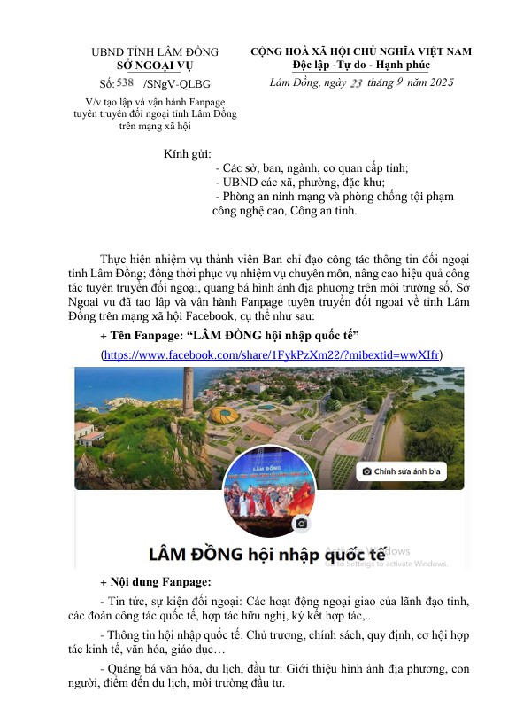 Thông báo về việc tạo lập và vận hành Fanpage tuyên truyền đối ngoại tỉnh Lâm Đồng trên mạng xã hội
