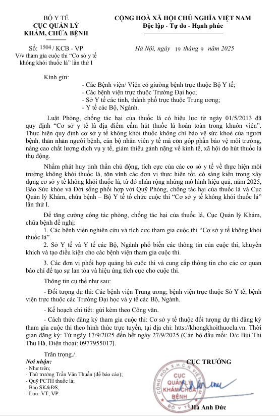 Để tăng cường công tác phòng, chống tác hại của thuốc lá, Cục Quản lý Khám, chữa bệnh đề nghị: