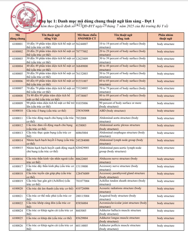 Thứ ba, 09/09/2025 | 10:08 - 62 A- A A+ | Triển khai Quyết định số 2427/QĐ-BYT ngày 25/7/2025 của Bộ Y tế về việc ban hành Danh mục mã dùng chung thuật ngữ y học lâm sàng - Đợt 1 03_Phu_luc_01__Danh_muc_Cau_truc_co_the__signed_6ef8a.pdf , 02__Quyet_dinh__ban_hanh_Danh_muc_thuat_ngu_lam_sang_signed_5f94b.pdf Đọc bài 03_Phu_luc_01__Danh_muc_Cau_truc_co_the__signed_6ef8a.pdf , 02__Quyet_dinh__ban_hanh_Danh_muc_thuat_ngu_lam_sang_signed_5f94b.pdf File đính kèm Trình duyệt không hỗ trợ iframe. File đính kèm Trình duyệt không hỗ trợ iframe.